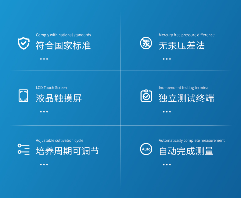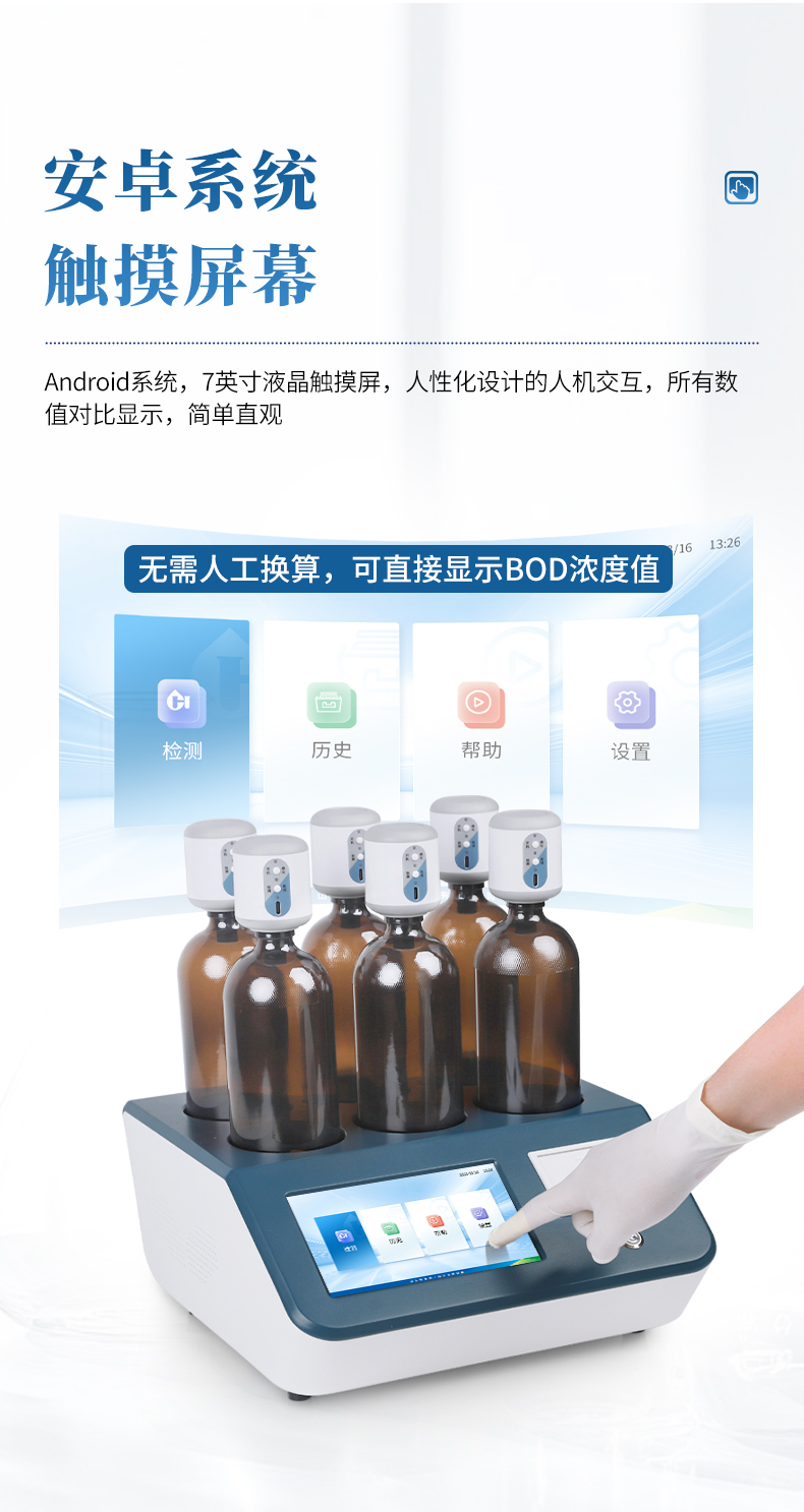 生化需氧量(BOD)测定仪是参考国家标准《HJ505-2009》5日培养法,模拟自然界中有机物的生物降解过程,采用简单、安全、可靠的无汞压差感测法测量水中BOD浓度;全智能化设计,领先的研发工艺和设计制造,实验过程无需实验人员值守;适用于排污企业、环境监测、污水处理厂、第三方检测机构、科研、高校等领域的生化需氧量测定。