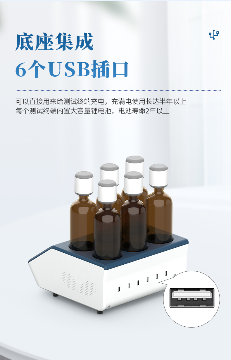 9、★底座集成了6个USB插口,可以直接用来给测试终端充电,充满电使用长达半年以上。