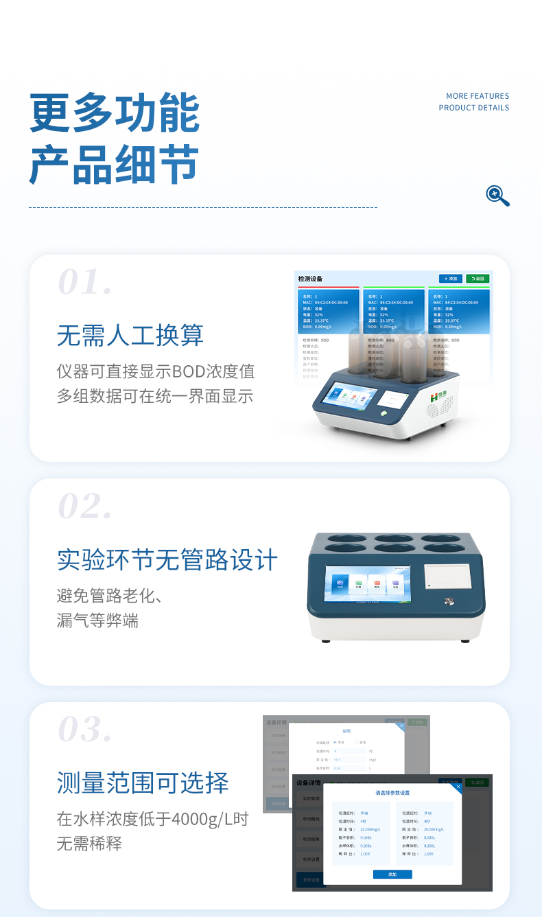6、无需人工换算,仪器可直接显示BOD浓度值,多组数据可在统一界面显示;