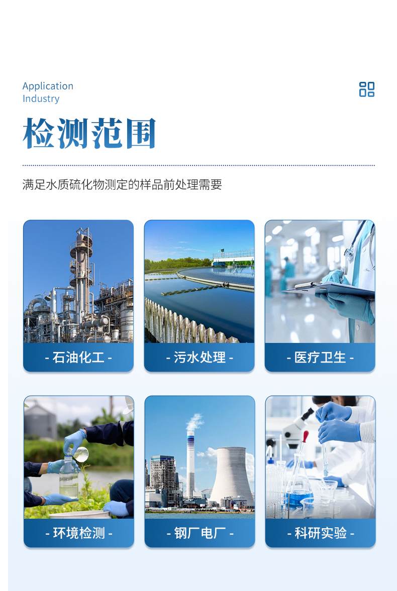 水样中的硫化物经酸化,生成的硫化氢随载气(氮气)进入吸收瓶/吸收显色管中被吸收溶液(乙酸锌-乙酸钠溶液或2%氢氧化钠溶液)吸收,选择相应的分析方法对吸收瓶/吸收显色管中吸收的硫离子进行分析测定。