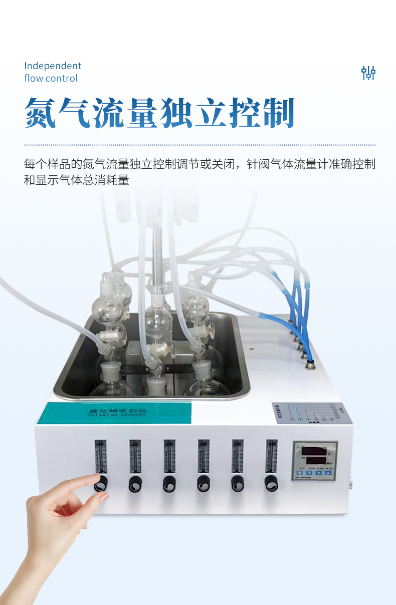 3.每个样品的氮气流量独立控制调节或关闭,针阀气体流量计准确控制和显示气体总消耗量。