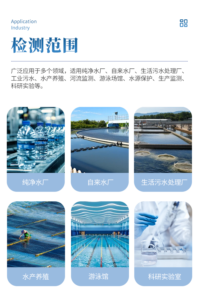 可以广泛应用于发电厂、纯净水厂、自来水厂、生活污水处理厂、饮料厂、环保部门、工业用水、制酒行业及制药行业、防疫部门、医院、化工产品等行业。