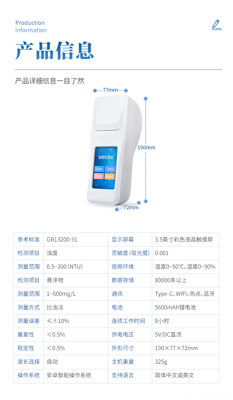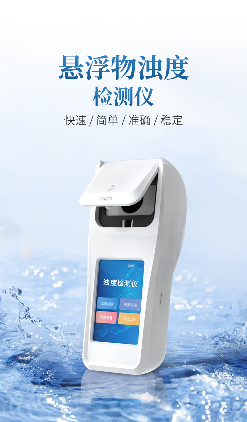 便携式水质浊度快速测定仪用于测量悬浮于水或透明液体中不溶性颗粒物质所产生的光的散射程度,并能定量表征这些悬浮颗粒物质的含量。