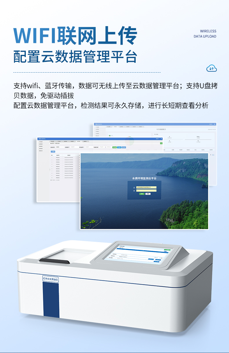 6)强大的后台数据支持,用户检测完样品后,不但可以通过打印机打印结果和保存在本地,还可以通过WIFI或4G连接互联网上传到云平台数据库中;