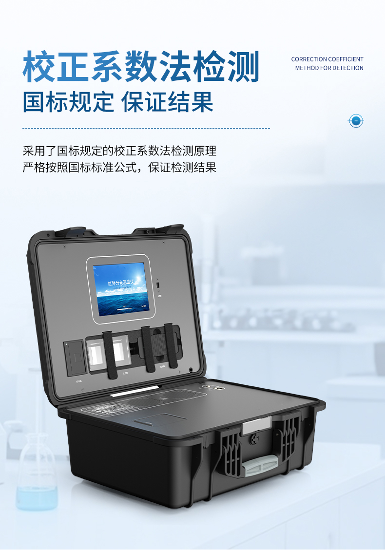 1)本产品采用了国标规定的校正系数法检测原理,严格按照国标标准公式,使用20mg/L正十六烷,20mg/L异辛烷,100mg/L苯进行校准,最终带入校准公式算出仪器校正系数进行测量样品(也可以使用标准曲线法进行检测);