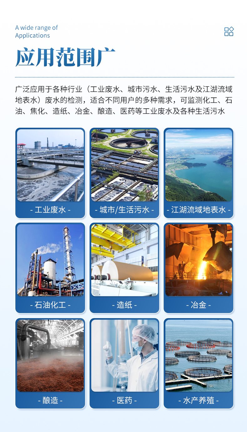 能够广泛的应用于锅炉水、工业废水、城市污水、农业灌溉、水产养殖、工业水处理、泳池水等行业。