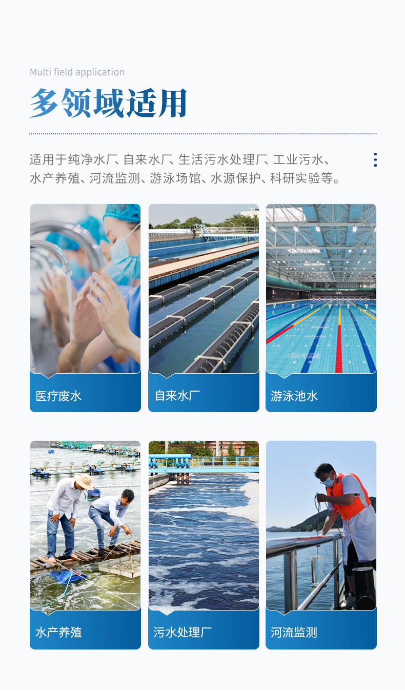 适用于游泳场馆、户内外游泳池、水上乐园、温泉浴池、纯净水厂、自来水厂、生活污水处理厂、工业污水、水产养殖、河流监测、水源保护、生产监测、科研实验等。