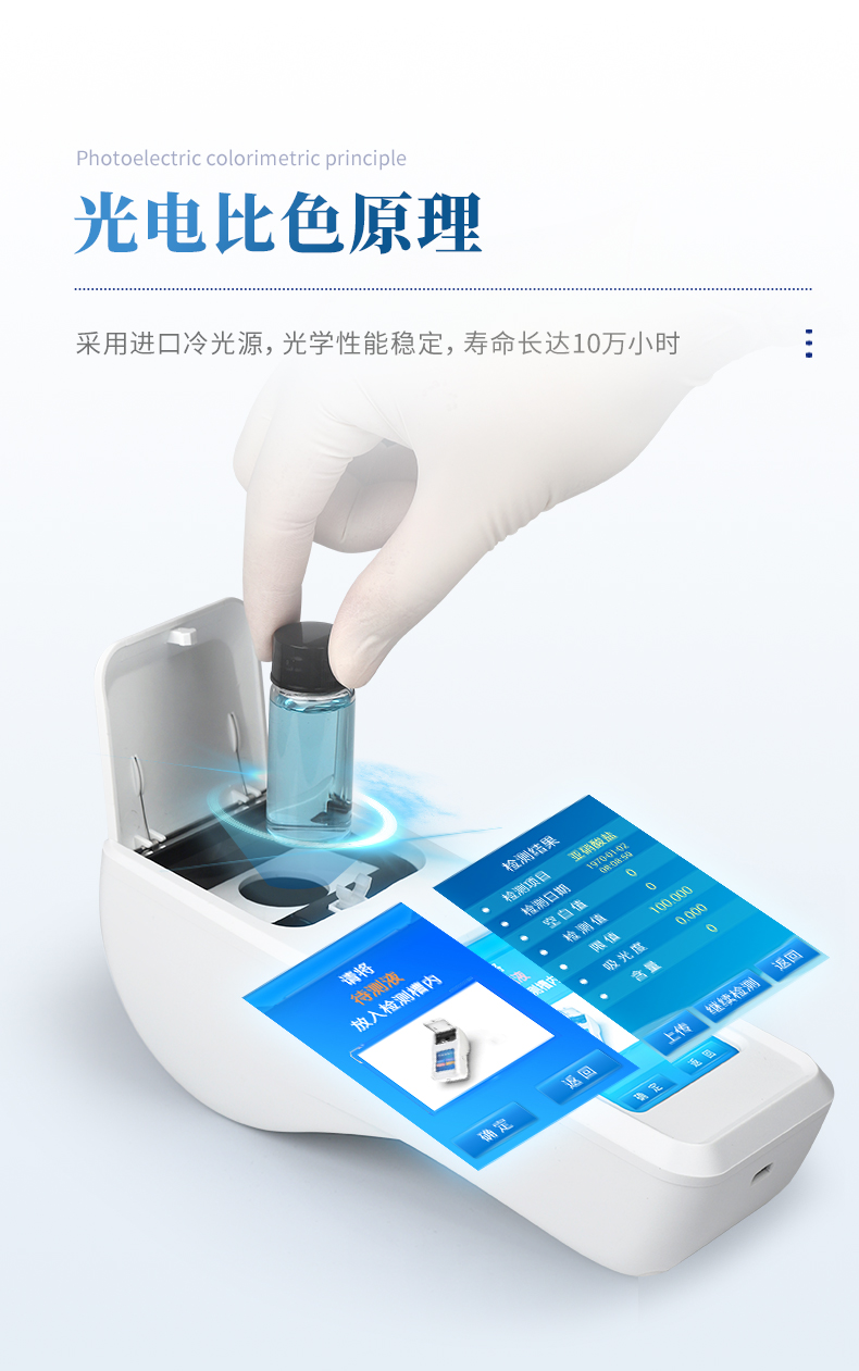 提取一定量水体样品,经过前处理后根据不同检测项目按照试剂说明书滴入检测试剂,检测试剂会与水体中的待测物质发生反应,反应液呈现特定的颜色。