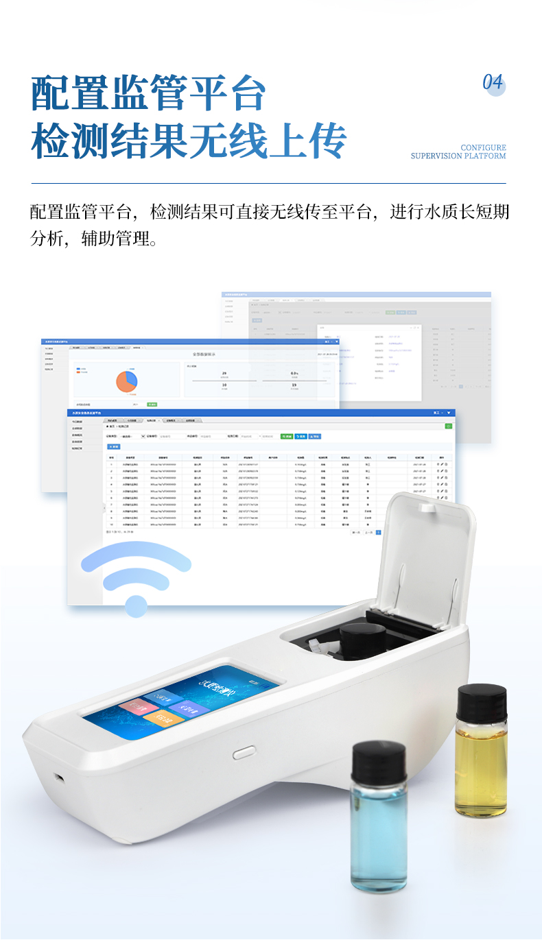 ②配置云监控平台,检测结果可直接无线传至平台,进行水质长短期分析,辅助管理。