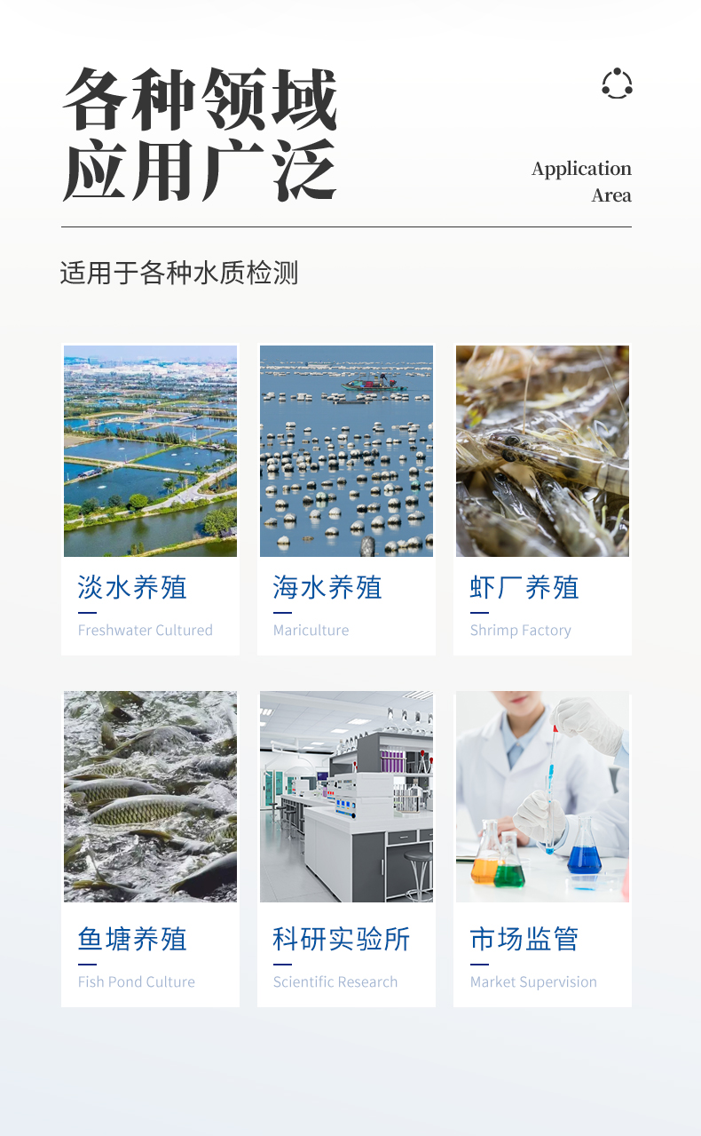 适用于纯净水厂、自来水厂、生活污水处理厂、工业污水、水产养殖、河流监测、游泳场馆、水源保护、生产监测、科研实验等。