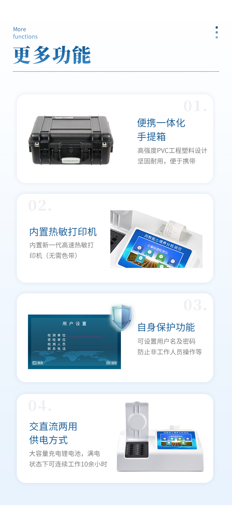 1、本仪器集各功能于一身,无需用户自配附件,可灵活流动检测。