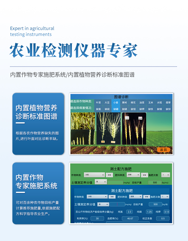 配套齐全:该仪器集药、器、仪为一体,携带方便,相当于一个小型移动实验室,无需用户自配附件,亦可灵活野外流动测试。适于农业服务部门或农资经销商、合作社、肥料厂商、大种植户测土施肥和鉴别肥料真假。