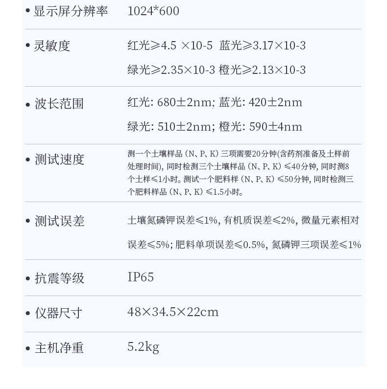 土壤氮磷钾误差≤1%,有机质误差≤2%,微量元素相对误差≤5%;肥料单项误差≤0.5%,氮磷钾三项误差≤1%。