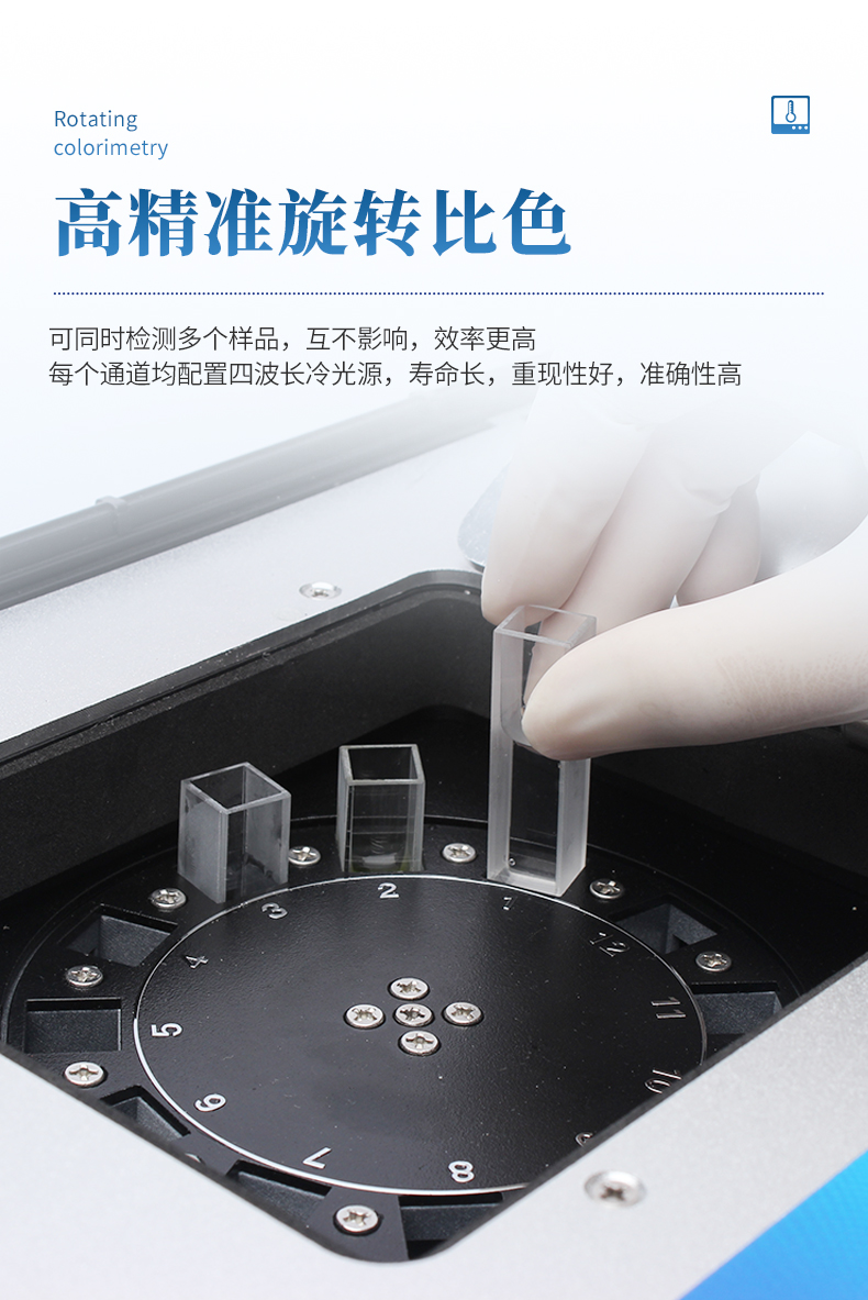 ★2、采用精密旋转比色池设计(专利号:ZL 2018 2 1777724.7),光源一致性更加精确,保证检测精度。