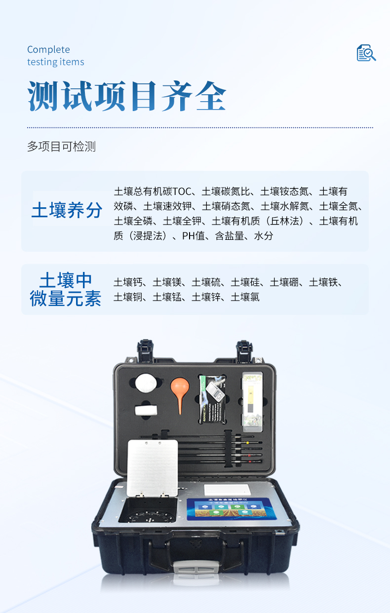 1、土壤养分:●土壤总有机碳TOC、土壤碳氮比、铵态氮、土壤有效磷、土壤速效钾、土壤硝态氮、土壤水解氮、土壤全氮、土壤全磷、土壤全钾、土壤有机质(丘林法)、土壤有机质(浸提法)、PH值、含盐量、水分。●土壤中微量元素:土壤钙、土壤镁、土壤硫、土壤硅、土壤硼、土壤铁、土壤铜、土壤锰、土壤锌、土壤氯;●土壤重金属:土壤铅、土壤砷、土壤镉、土壤铬、土壤汞。