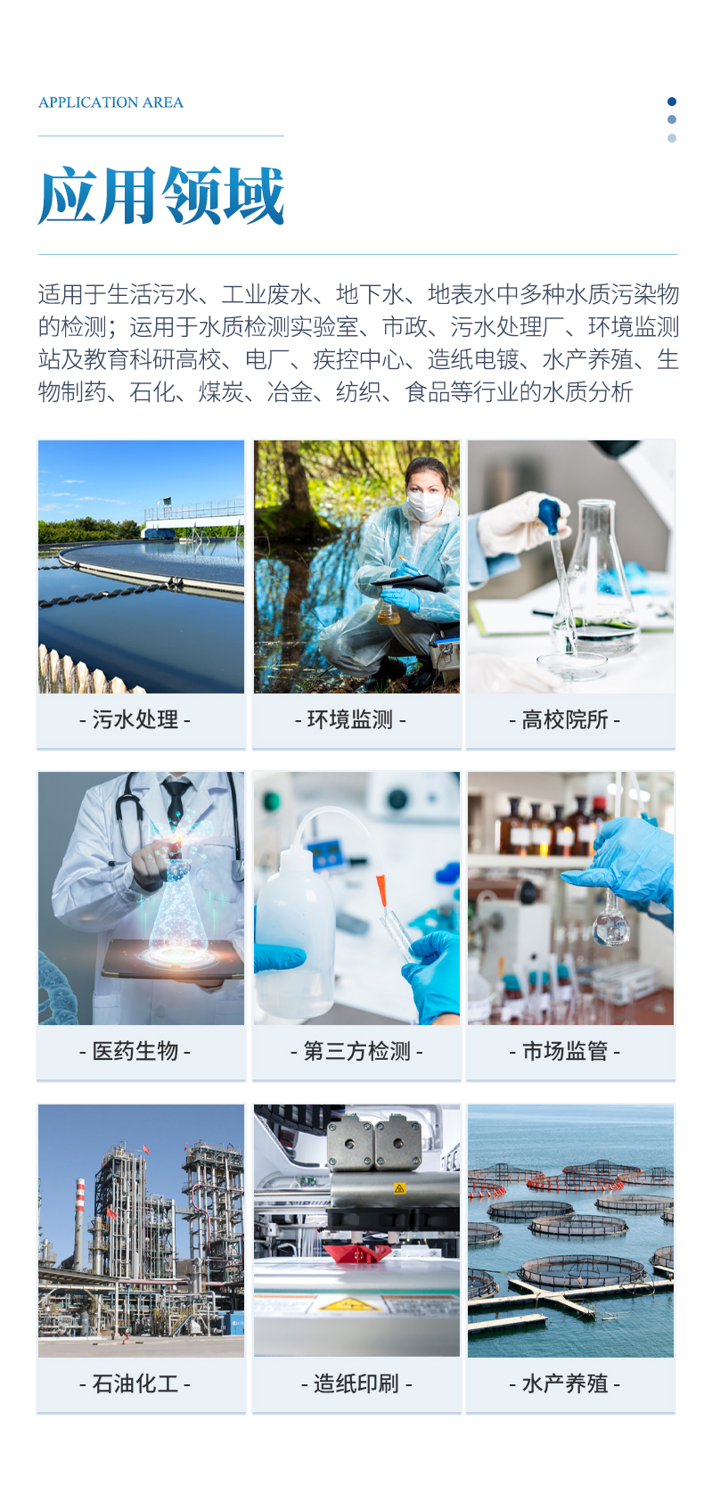 适用于生活污水、工业废水、地下水、地表水中多种水质污染物的检测;运用于水质检测实验室、市政、污水处理厂、环境监测站及教育科研高校、电厂、疾控中心、造纸电镀、水产养殖、生物制药、石化、煤炭、冶金、纺织、食品等行业的水质分析。