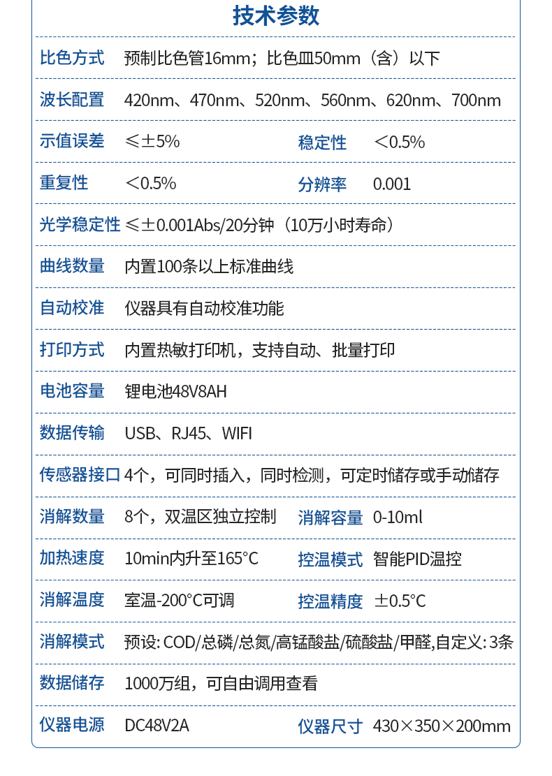 4、内置双温区8孔消解仪,左右温区独立控制,可对COD总磷总氮等进行快速消解。
