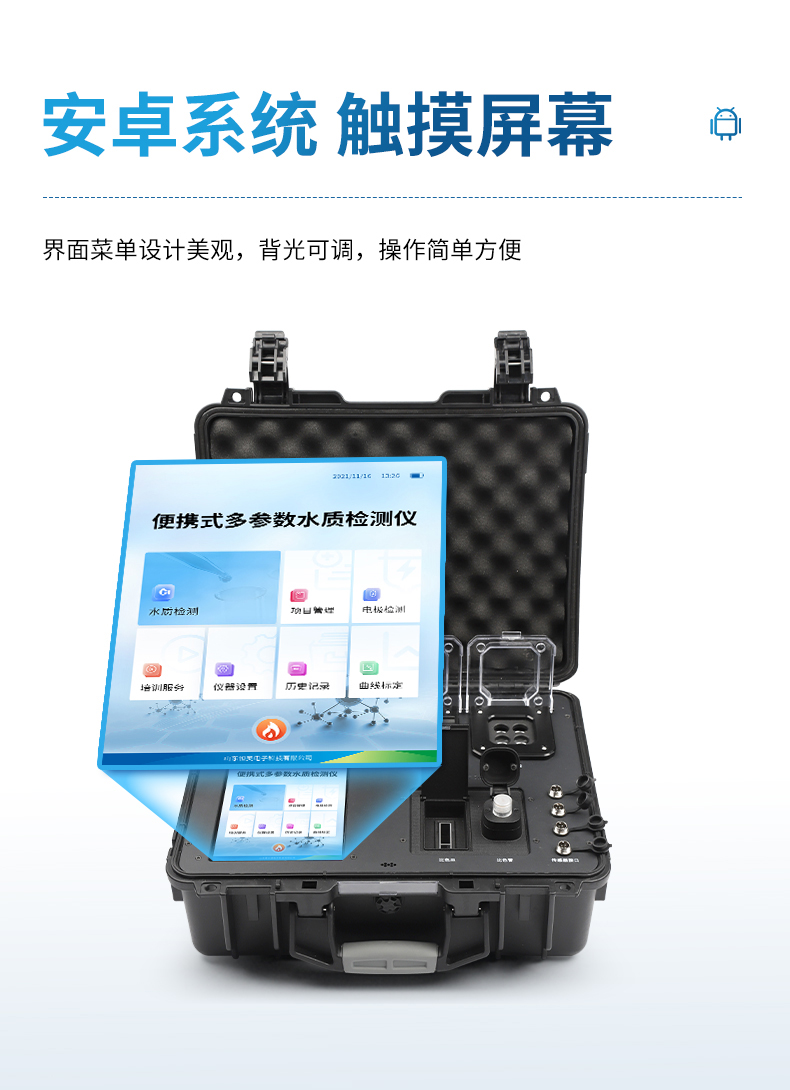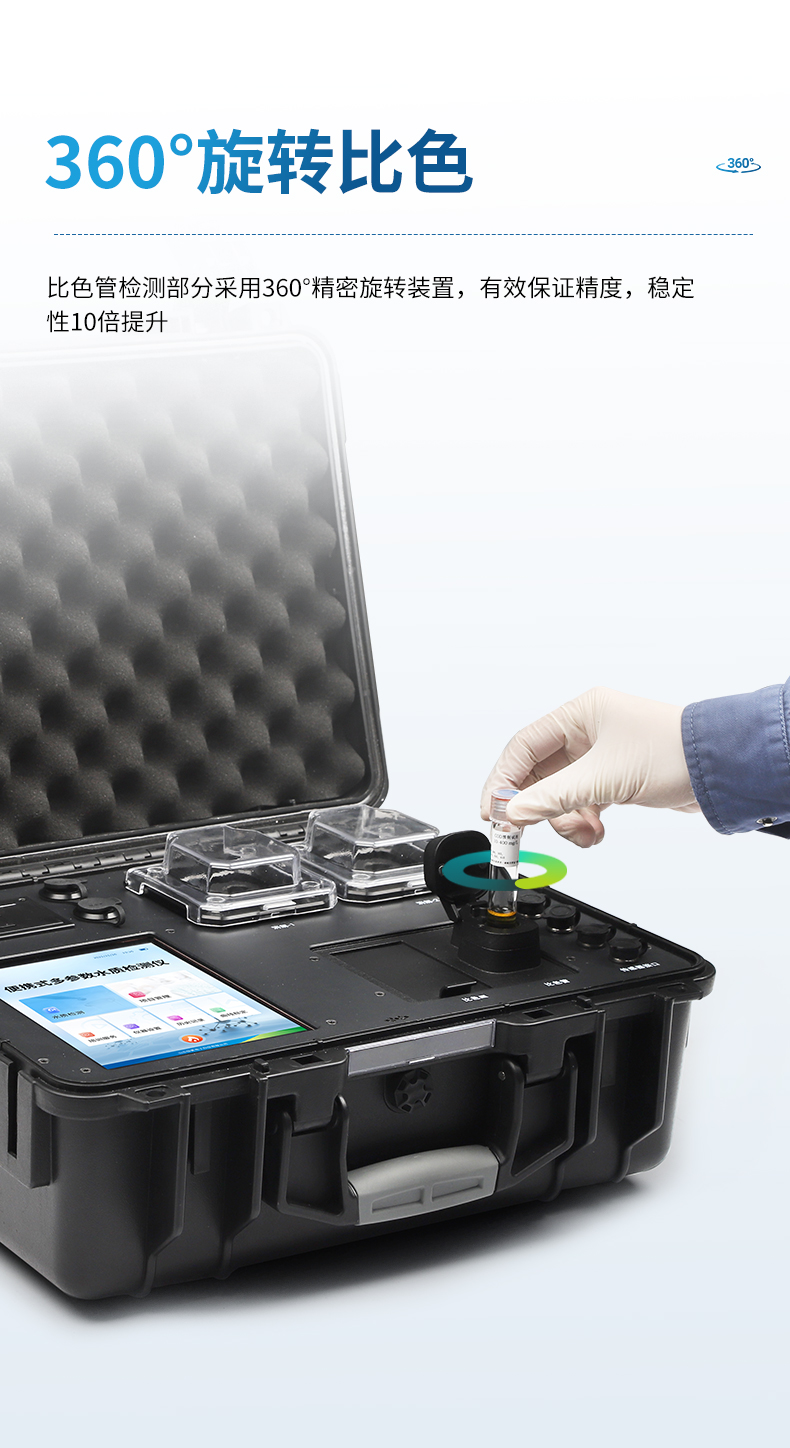 便携式COD氨氮总磷总氮检测仪采用高强度PVC工程塑料手提箱设计,消解检测一体式设计,其中消解模块具备双温区功能,检测部分同时具备360°旋转比色管检测和比色皿检测,安卓智能操作系统,8英寸高清液晶触摸屏,光纤检测技术,进口光源,内置大容量锂电池,便携多参数水质检测仪具有性能稳定、测量准确、测定范围广、功能强大、操作简单等特点。