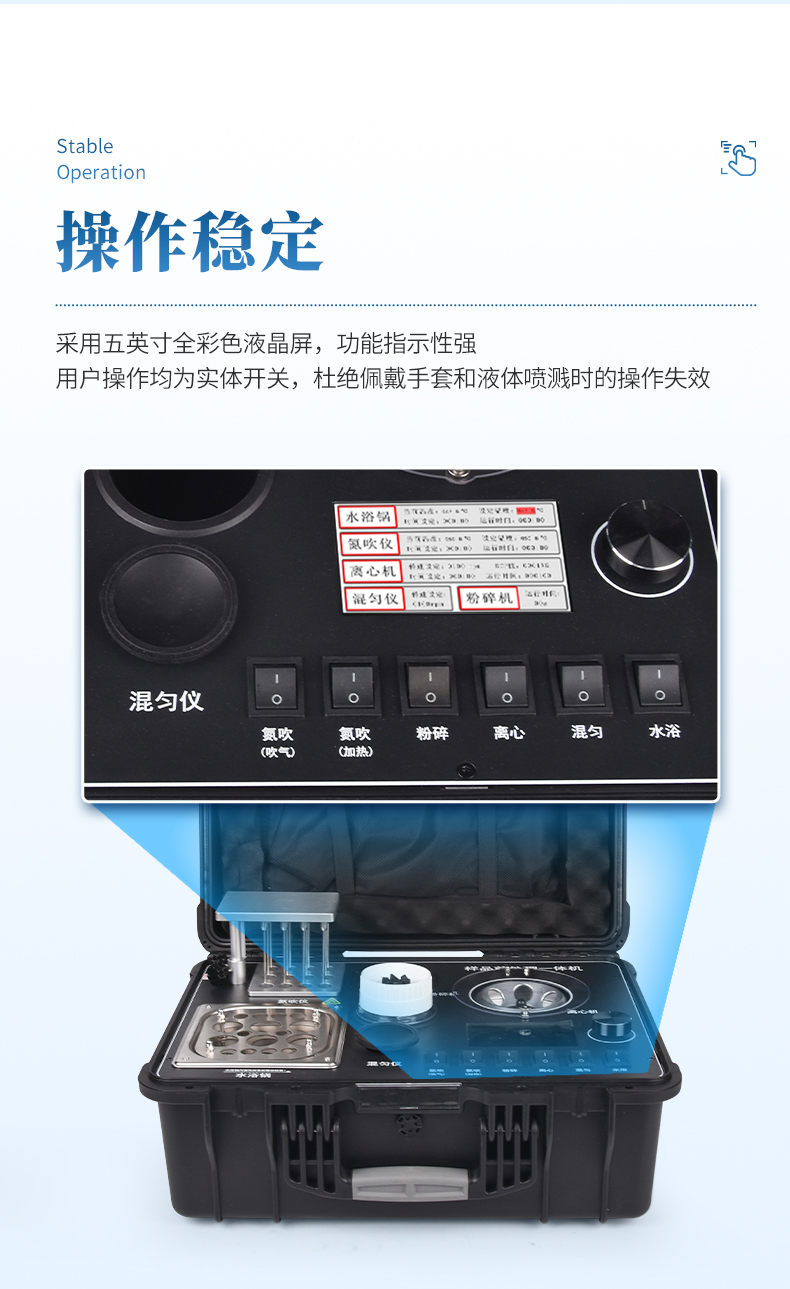 QC4型四合一样品检测前处理一体机(箱)是集吹干、离心、均质、混匀功能的一体化整合,极大的简化和集中样品前处理的一般操作过程,结合移动便携的工程塑料箱体,特别适合农兽药残留畜禽水产品质量安全现场快速检测。