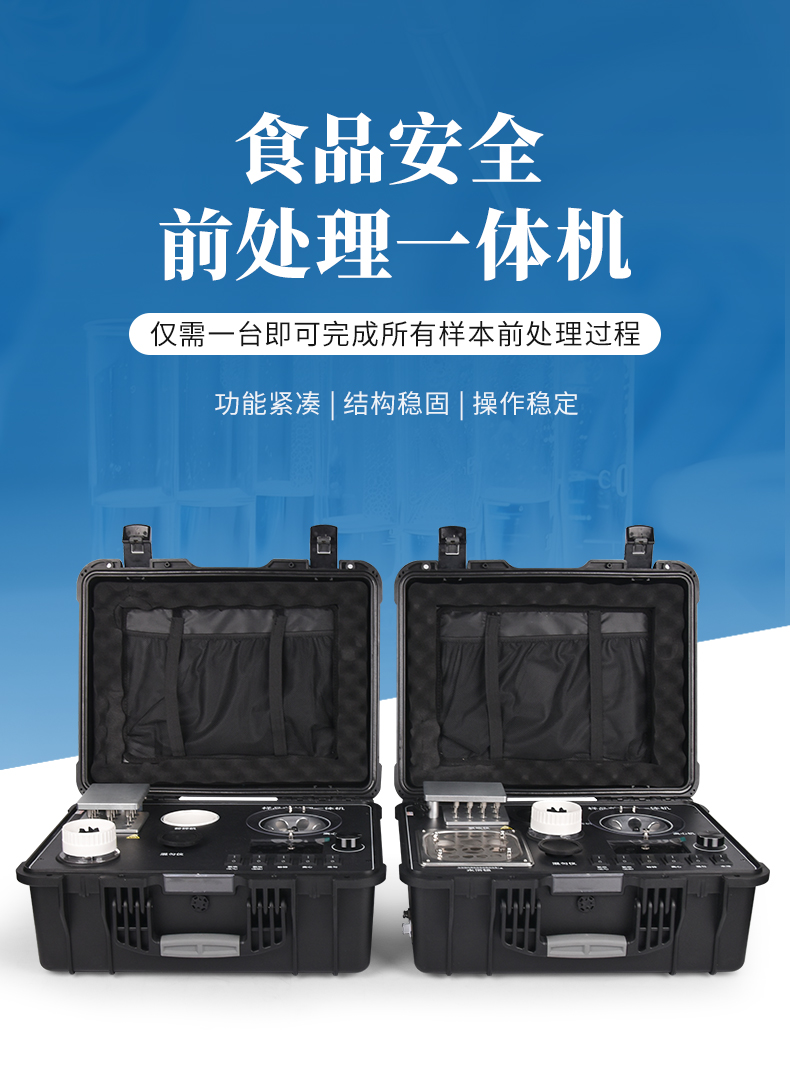 QC4型四合一样品检测前处理一体机(箱)是集吹干、离心、均质、混匀功能的一体化整合,极大的简化和集中样品前处理的一般操作过程,结合移动便携的工程塑料箱体,特别适合农兽药残留畜禽水产品质量安全现场快速检测。