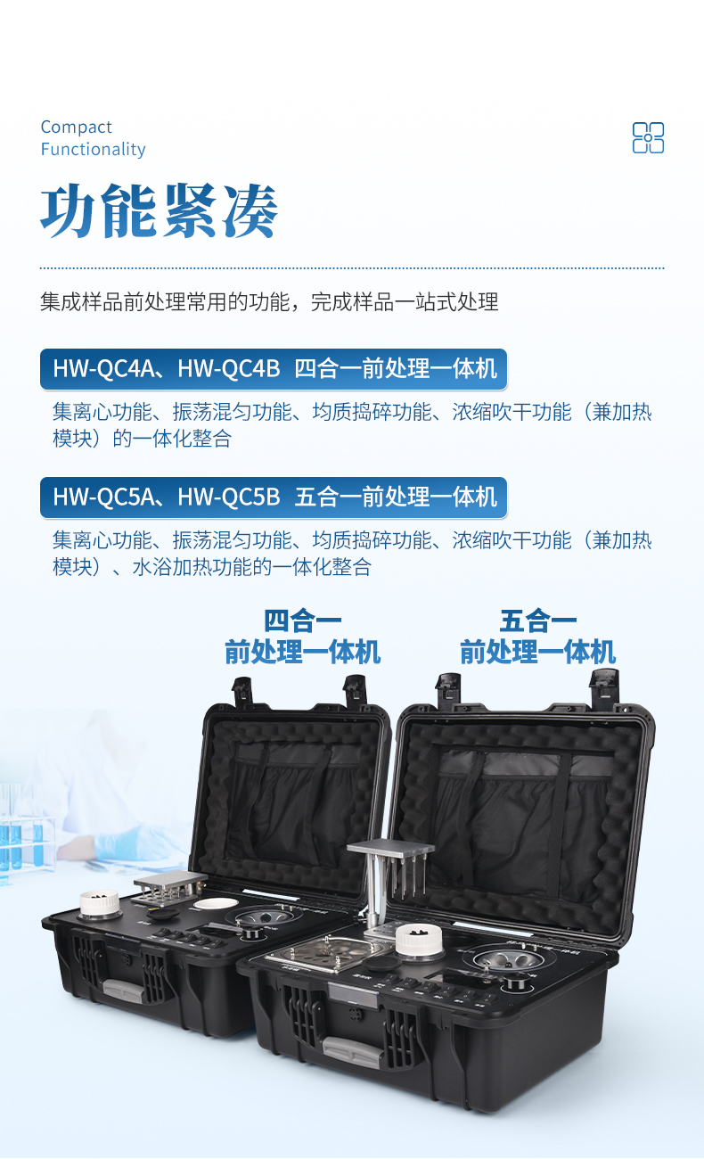 1、功能紧凑,集成四种样品前处理常用的功能,完成样品一站式处理。