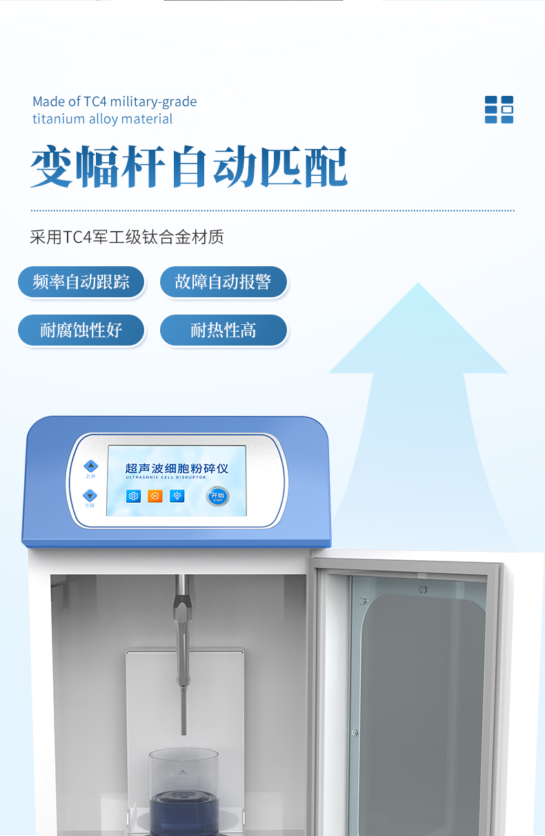 利用超声波在液体中的分散效应,使液体产生空化的作用,从而使液体中的固体颗粒或细胞组织破碎.超声波细胞粉碎机由超声波发生器和换能器二大部分组成。超声波发生器将市电转变成20-25KHz交变电能供给换能器。锆钛酸钡压电振子是换能器的心脏,它随交变电压以20-25KHz频率作伸缩弹性形变,换能器随之作纵向机械振动。振动波通过浸入在生物溶液中的钛合金变幅杆产生空化效应,激发介质里的生物微粒剧烈振动。