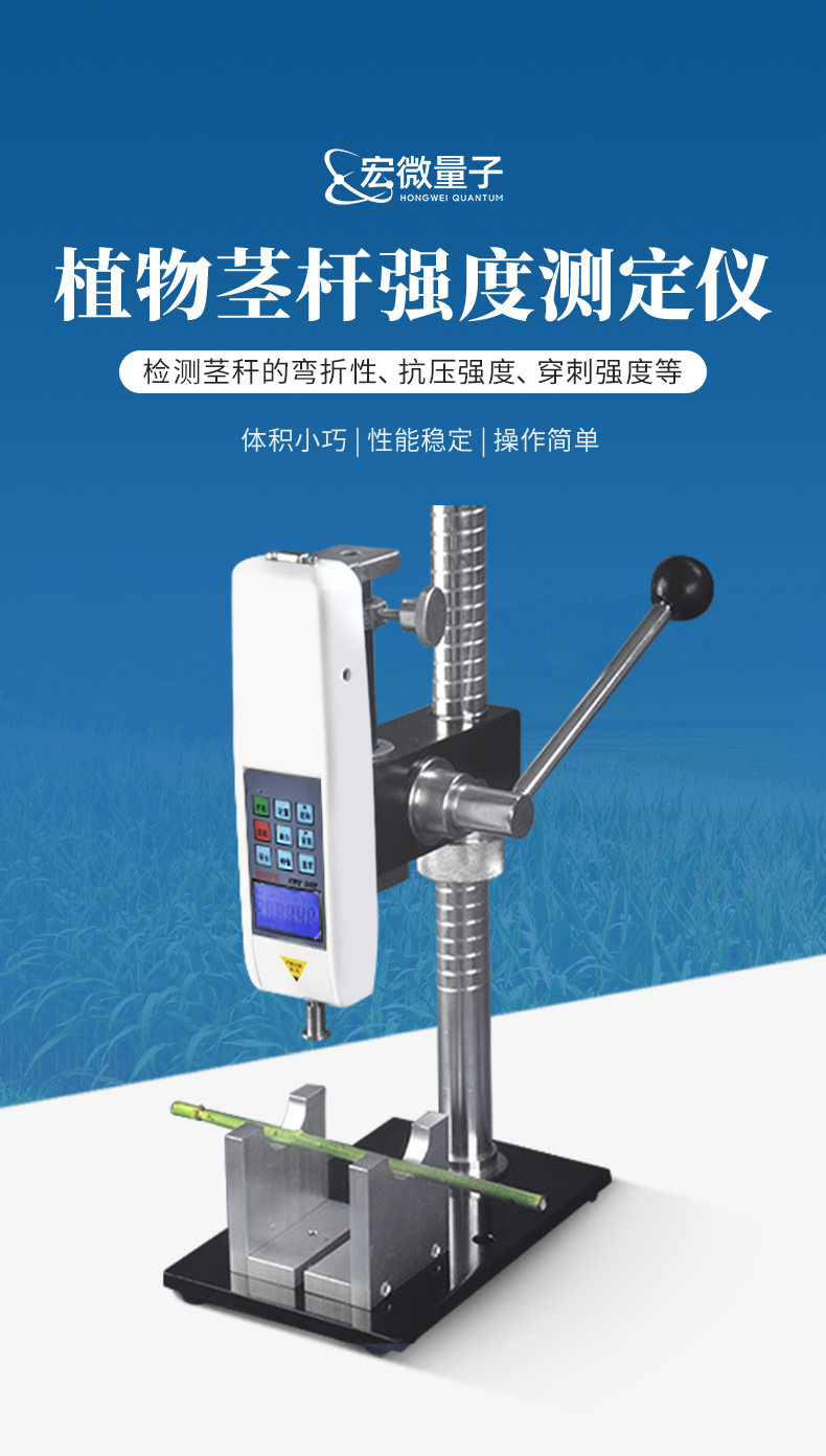 植物茎秆的强度是决定作物抗倒伏能力的一个主要因素,长期以来玉米,高梁、烟草等的倒伏给作物的机械收割造成很大的困难。从机械化水平来说,造成大量的粮食浪费。另外,作物倒伏导致光照不充分,使其生产量受到极大的限制。在作物生长的各个阶段对其茎秆进行活体测量,进而根据茎杆纤维层的抗弯阻力与抗倒伏能力的相关性对群体测量数据进行统计处理,对作物的栽培和育种具有重要意义。植物茎秆强度仪采用拉压力传感器,通过针刺、压碎、折断的方式测出茎秆断裂或者屈服瞬间产生的最大力,即茎秆的强度。