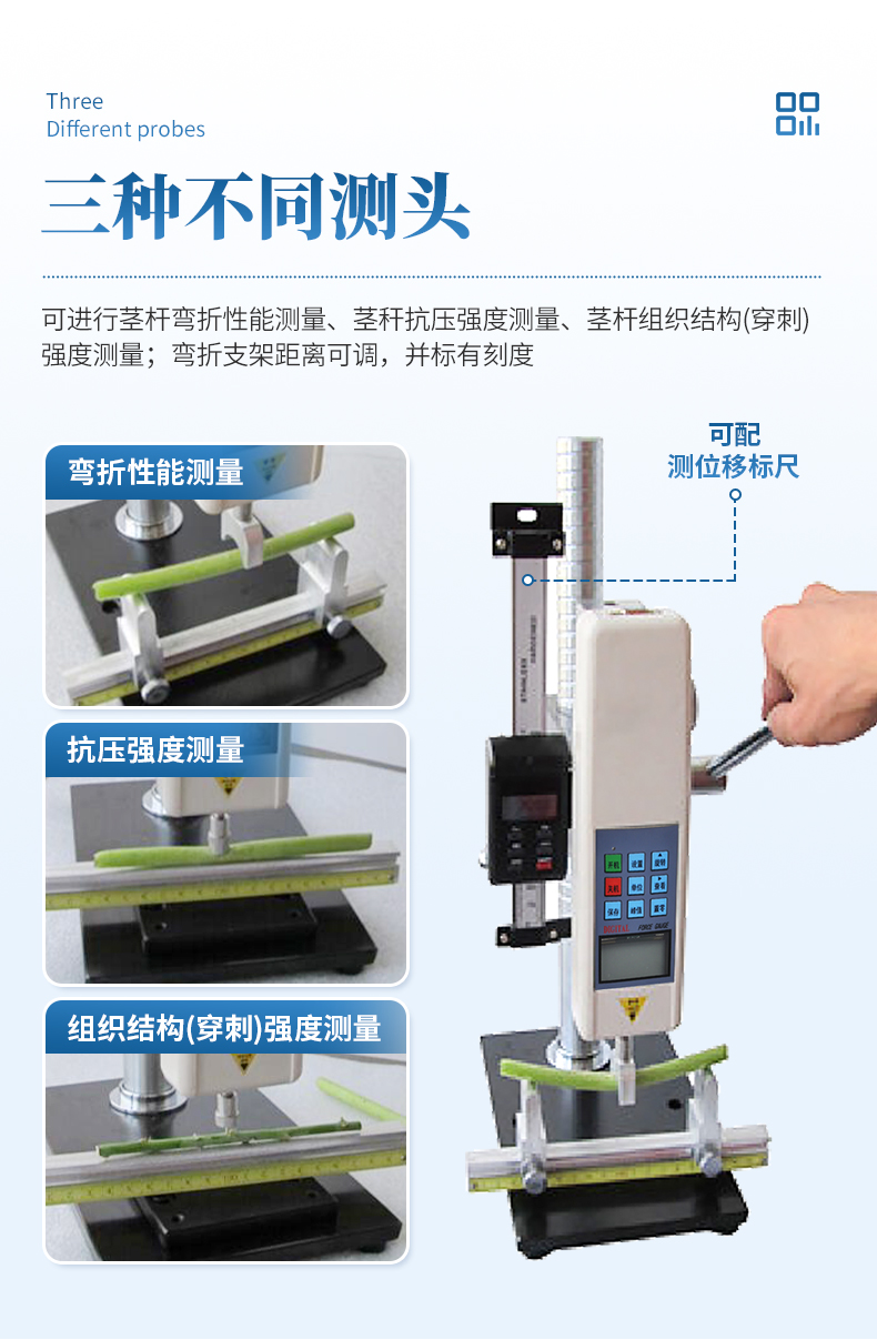 1、三种不同测头:可进行茎杆弯折性能测量、茎秆抗压强度测量、茎杆组织结构(穿刺)强度测量;弯折支架距离可调,并标有刻度。