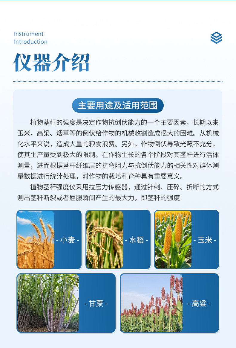 植物茎秆的强度是决定作物抗倒伏能力的一个主要因素,长期以来玉米,高梁、烟草等的倒伏给作物的机械收割造成很大的困难。从机械化水平来说,造成大量的粮食浪费。另外,作物倒伏导致光照不充分,使其生产量受到极大的限制。在作物生长的各个阶段对其茎秆进行活体测量,进而根据茎杆纤维层的抗弯阻力与抗倒伏能力的相关性对群体测量数据进行统计处理,对作物的栽培和育种具有重要意义。植物茎秆强度仪采用拉压力传感器,通过针刺、压碎、折断的方式测出茎秆断裂或者屈服瞬间产生的最大力,即茎秆的强度