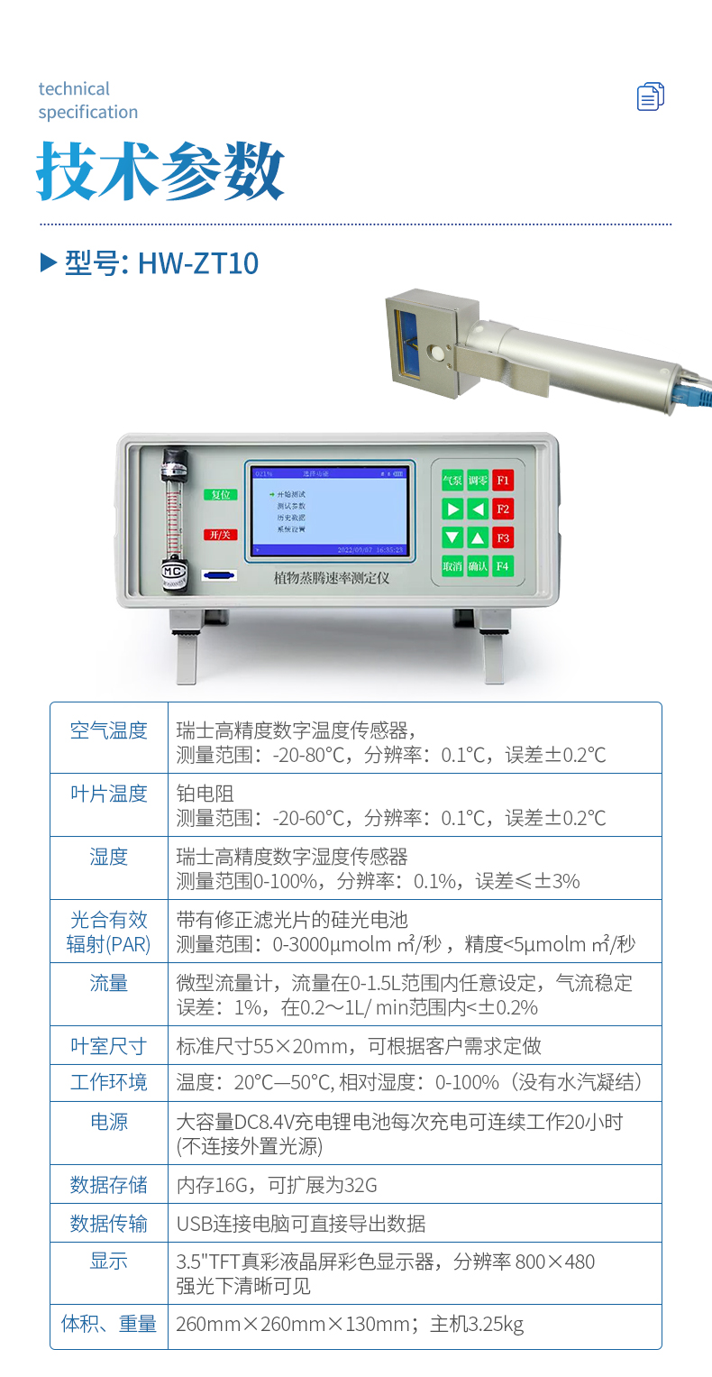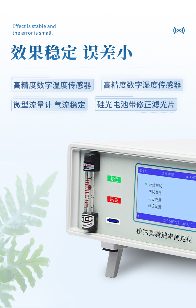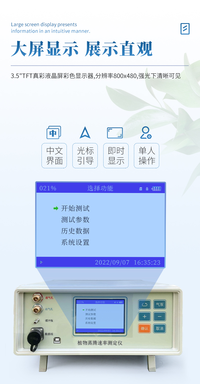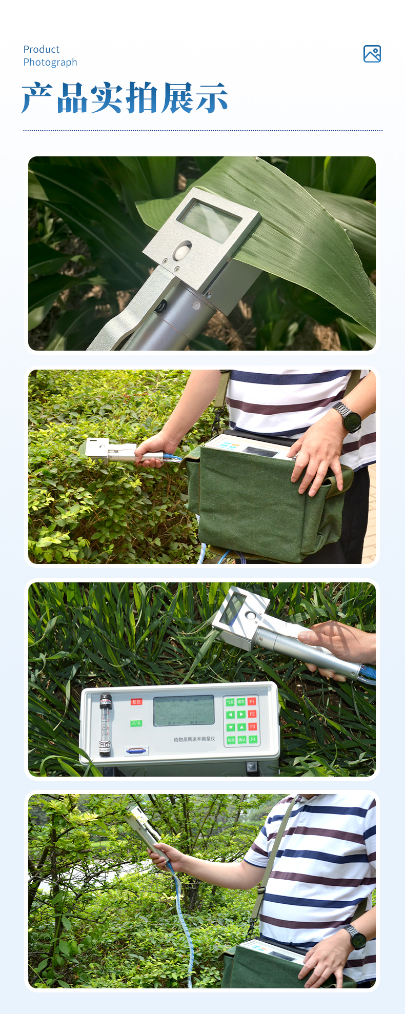 植物蒸腾速率是指水分通过植物体内时,经过植物体表(主要是叶片)以气体的方式散发到大气中的速度。植物的蒸腾作用能产生的蒸腾拉力,蒸腾拉力是植物被动吸水与转运水分的主要动力,这对高大的乔木尤为重要;蒸腾作用可以促进木质部汁液中物质的运输,土壤中的矿质盐类和根系合成的物质可随着水分的吸收和集流而被运输和分布到植物体各部分去;蒸腾作用还可以降低植物体的温度,防止叶片被灼伤,这是因为水的气化热高,在蒸腾过程中可以散失掉大量的辐射热。蒸腾作用的正常进行有利于CO2的同化,这是因为叶片进行蒸腾作用时,气孔是开放的,开放的气孔便成为CO2进入叶片的通道。因此作物植物蒸腾速率测量仪对于农业科研、教学、园艺研究、林业研究等具有重大意义。