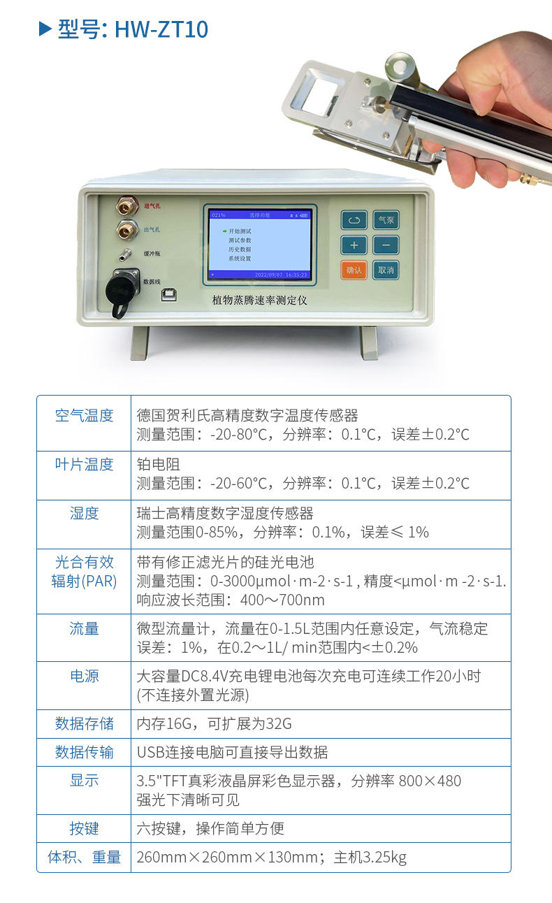 植物蒸腾速率测定仪是一款采用开闭路两种测量方式的科研型仪器。用来测量各种因素对叶片气孔行为的影响,可方便、重复、准确地计算出气孔阻抗、气孔导度和蒸腾速率,还可测得空气温湿度,叶面温度,光合有效辐射。广泛的应用于植物叶片的水分生理研究,农作物水分利用、水分胁迫危害、生物化控调节效果等研究。